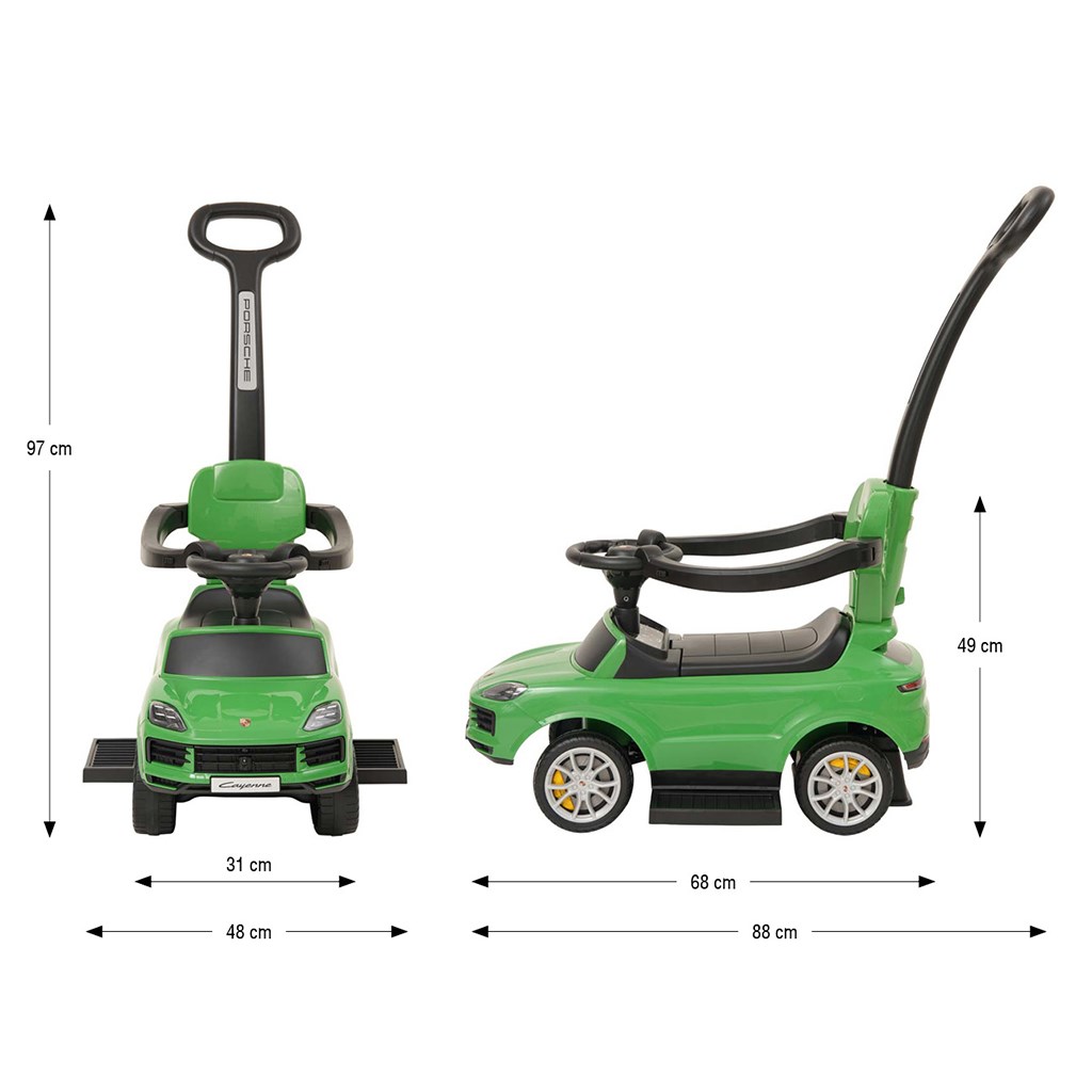 The Porsche Cayenne Milly Mally ride-on with push handle is a realistic car for toddlers that combines the function of a push walker and a classic ride-on.