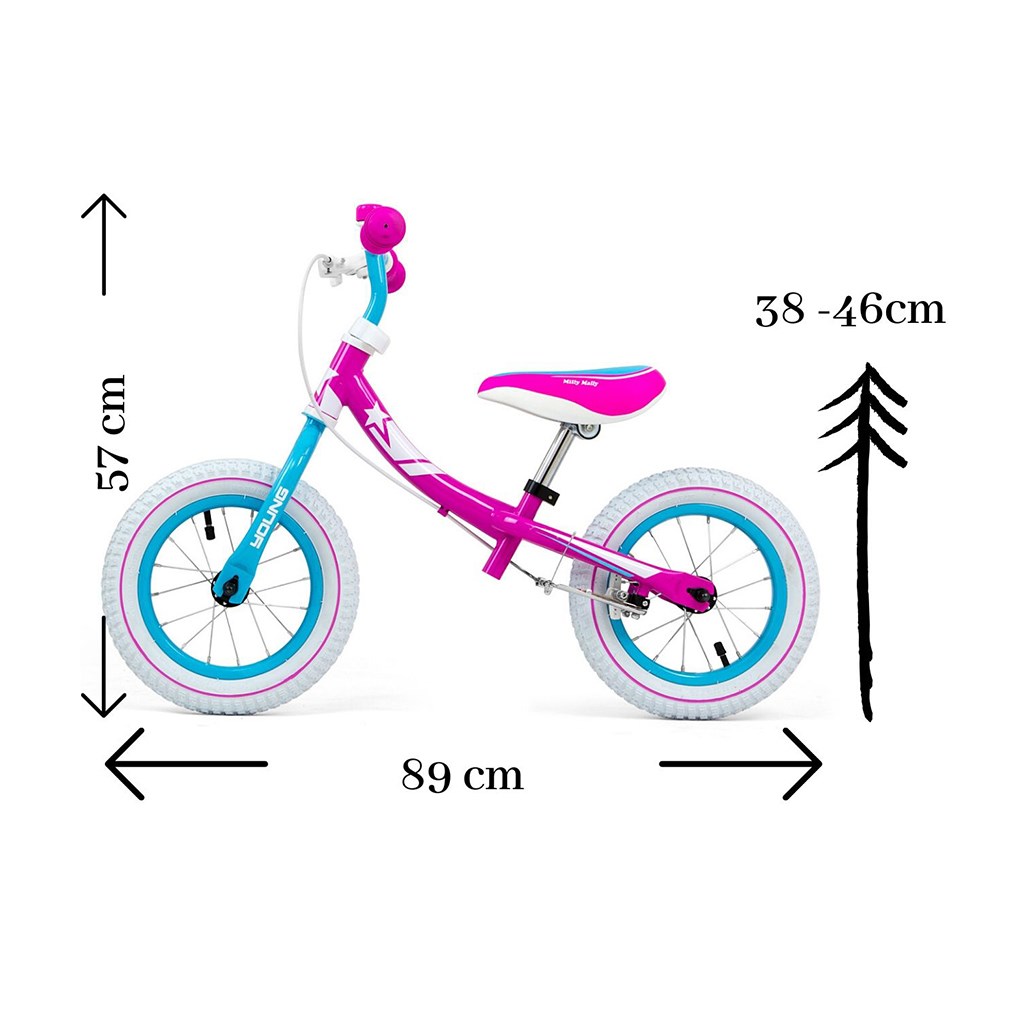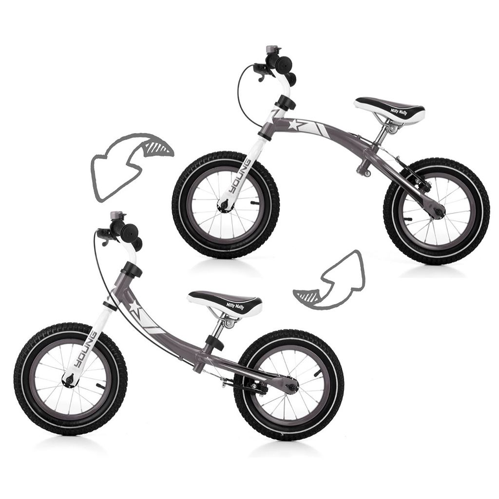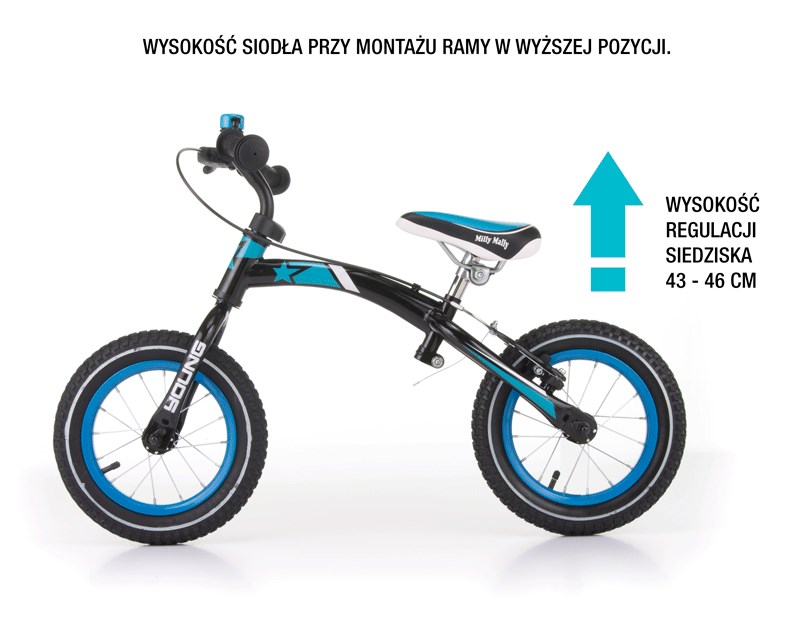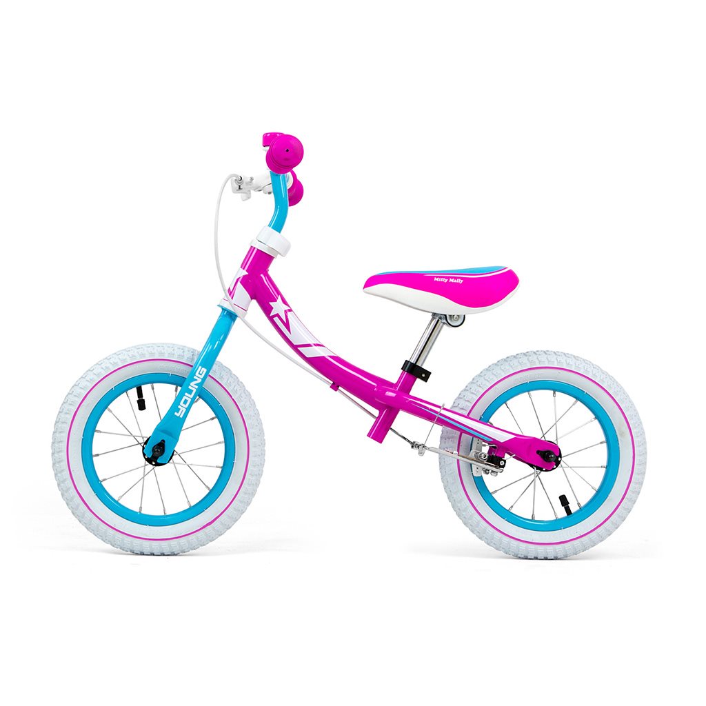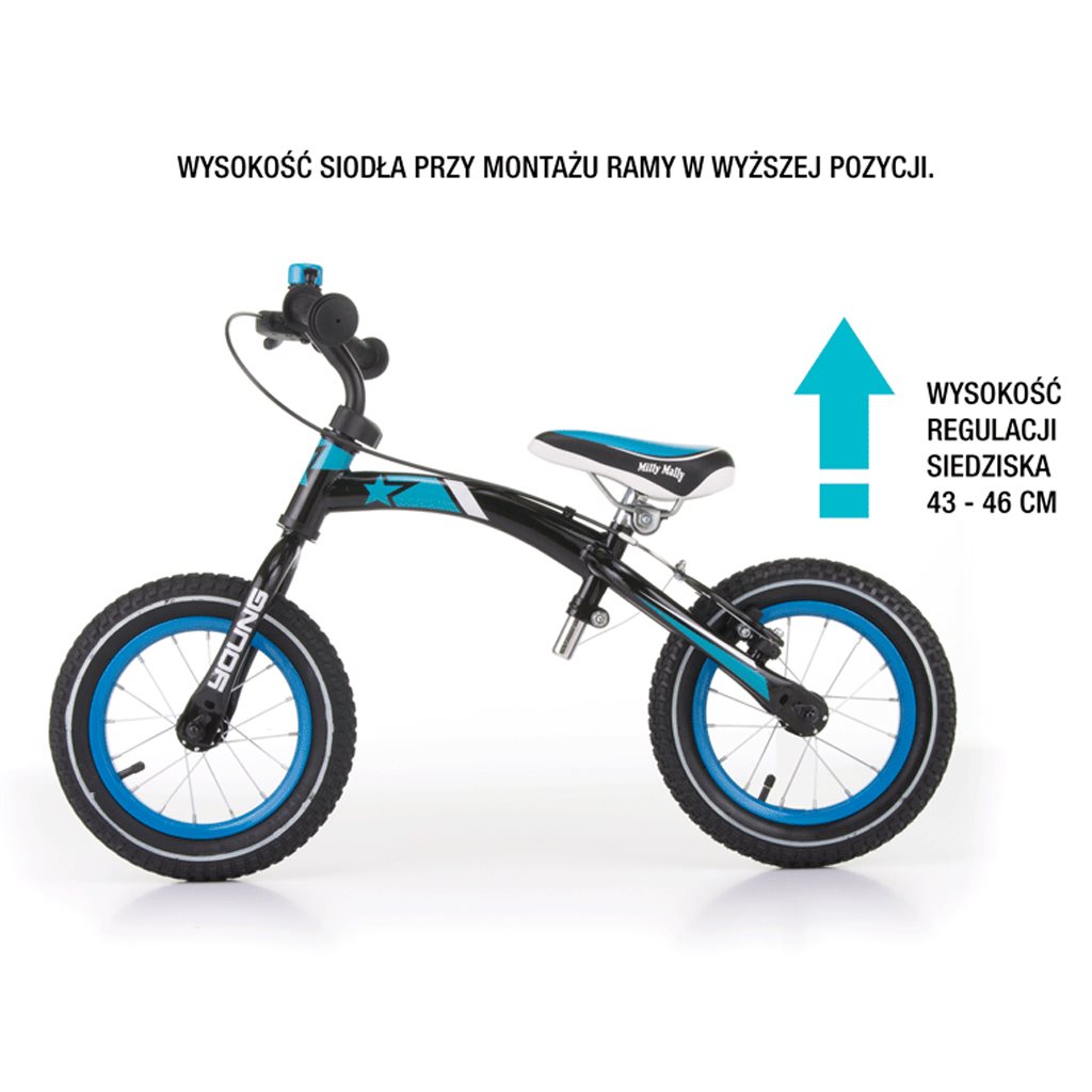 Milly Mally Young children's bicycle. The bicycle-bike is ideal when the child is learning to keep balance. It is the best alternative to a bicycle with side wheels, so that later riding on a classic bike will be much easier. The bike is without pedals, so the child can concentrate mainly on keeping balance and direction. It has a brake, a comfortable seat and a sturdy quality frame that can be rotated, so your child will be more comfortable when getting on.