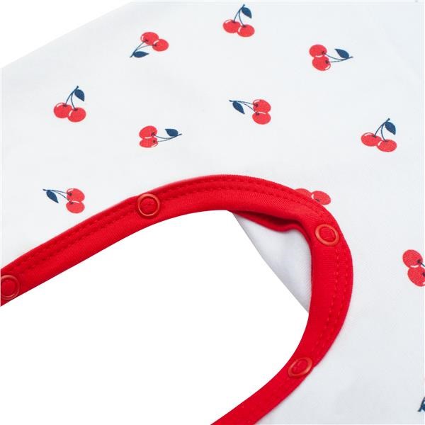 Beautiful cotton onesies for babies from the Czech brand New Baby Cherry. The onesies are decorated with Cherry applique with cherries. The patch is taped against scratches. The bottom part is fully printed with cherries. Around the neck and shoulder straps there is a coloured trim. Fastening on the shoulder straps and between the legs makes it easy to dress and change the baby. For babies, onesies are an important piece of clothing and with any movement, the baby's bottom is always covered. Thanks to the nice and high quality material, the baby will feel very comfortable and pleasant. Customer satisfaction is very important to New Baby and that is why we offer you our high quality Cherry girls summer collection. 100% cotton.