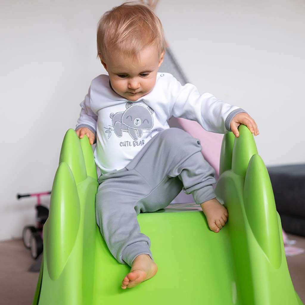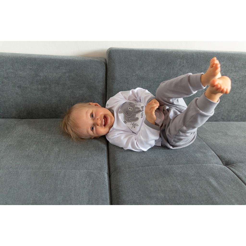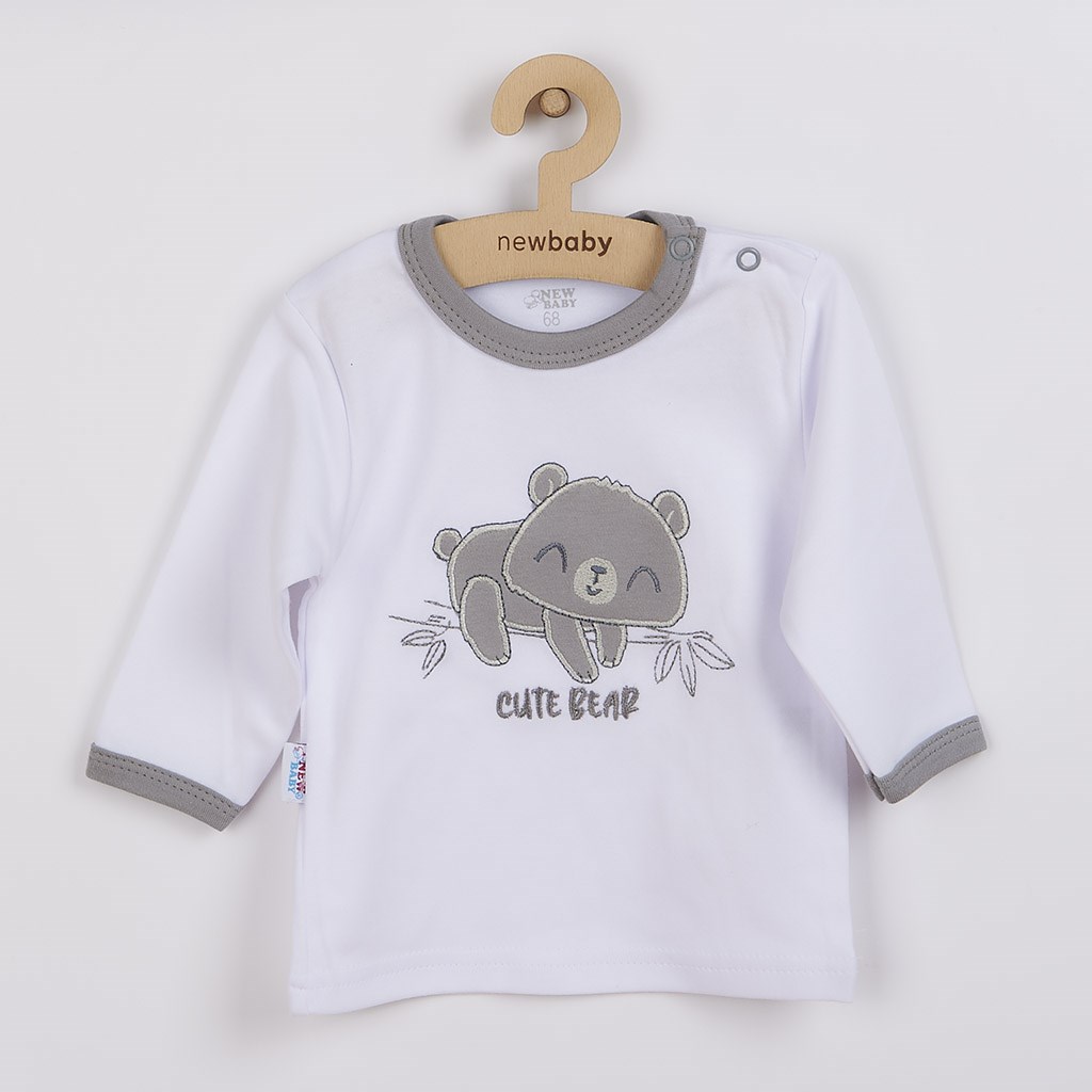 Cute baby 2 piece set by Czech brand New Baby Cute Bear for babies. The set is made of very nice, soft and high quality material that is suitable for babies. It contains a t-shirt and sweatpants. The t-shirt is decorated with an embroidered picture of a teddy bear. The picture is lined with anti-scratch fabric. Fastening with a stud on the shoulder strap. The sweatpants have a wider hem, are tapered at the legs with a hem and have two decorative buttons. The baby will feel very comfortable in this set, which is precisely and qualitatively sewn. We keep up with baby fashion and that's why we offer you our New Baby Cute Bear collection. 100% cotton.