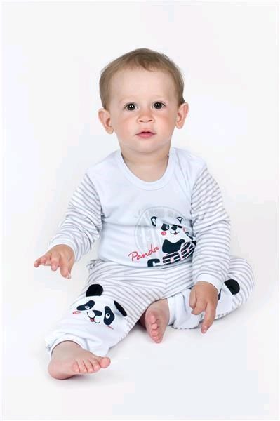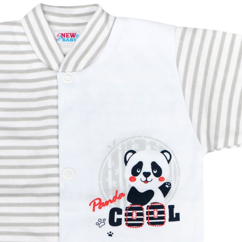 Cute cotton infant jumpsuit New Baby Panda for babies. The jumpsuit is striped and decorated with a picture of a panda and the word COOL. On the paws there is a panda head and 3D ears. Practical stud fastenings all along the length and between the legs make dressing and changing very easy. We put emphasis on quality and therefore, thanks to the soft, cuddly and high-quality material, your baby will feel very comfortable in the cover-up. The jumpsuit with a modern design is suitable for both girls and boys. 100% cotton.