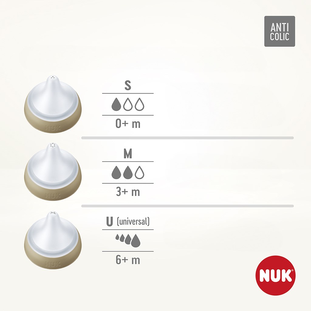 - 3x NUK Perfect Match baby bottles with patented temperature control indicator, one 150 ml bottle in size S (from 0 months for breast milk), two 260 ml bottles in size M (from 3 months for formula milk), can be combined with all accessories for the NUK Perfect Match and NUK Soft&Easy breast pumps