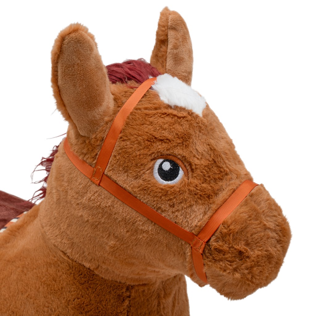 The hopper is covered with soft, non-slip plush, very pleasant to the touch. It features a sound module – when pressing between the ears, it makes a realistic horse sound, stimulating imagination and encouraging active play.