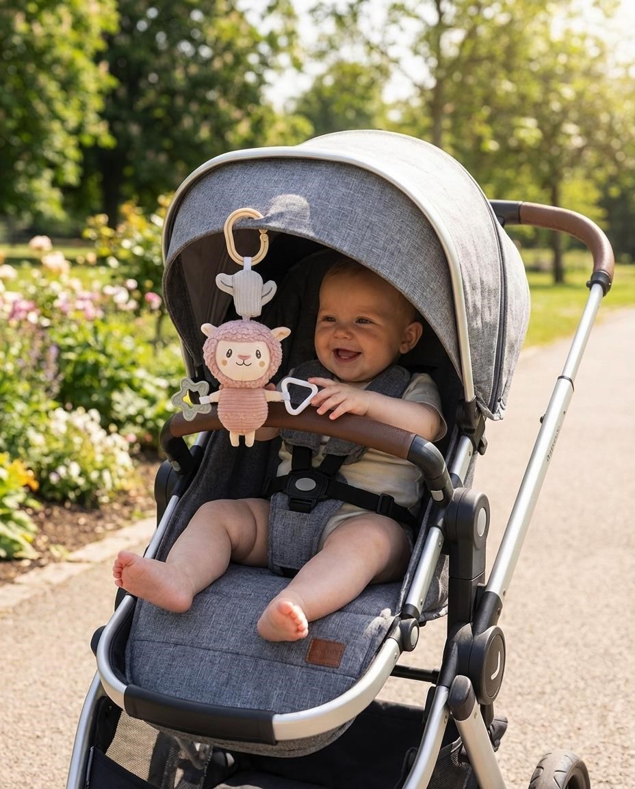 We present the New Baby Lama Plush Hanging Toy from the Lama Toys collection, designed to entertain your little one during travel and at home. This practical hanging toy combines the functions of vibration, a teether, and a rattle, providing excellent entertainment for the youngest children.
