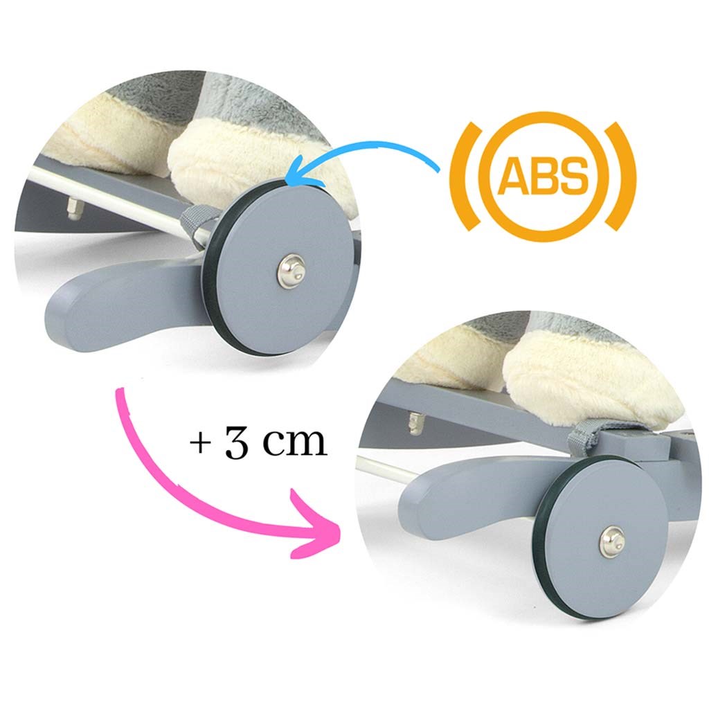 The soft Polly rocking horse was designed for the youngest children for whom traditional rocking horses are too big. The comfortable and contoured armchair-shaped seat and adjustable straps provide comfort and safety while your child rocks carefree. Footrests on the rails and handles further help maintain balance. Flip the simple mechanism on the rails to extend the wheels, turning the rocking toy into a riding horse in seconds. The rocking rails can simply be unscrewed. The entire horse is made of soft and very pleasant to the touch material. When you press the tabs, the horse neighs happily, when you press the other tab it makes a trotting sound. The batteries are inserted into the pouch on the belly. The toy helps the child to develop coordination of movements and stimulates his imagination.