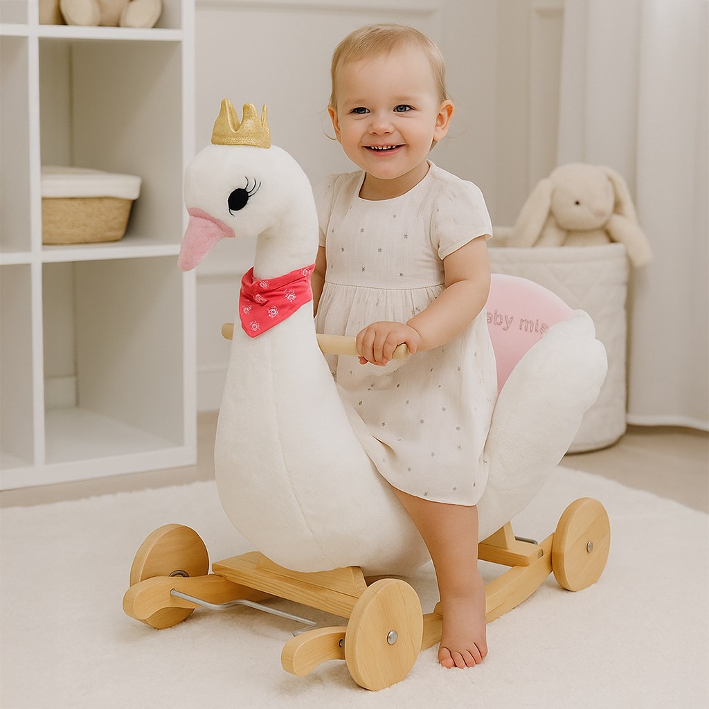 With its built-in melody, rocking on the swan becomes even more enjoyable, stimulating the child's sense of hearing and encouraging active play. The toy is also equipped with wheels, allowing it to move smoothly across different surfaces while ensuring safety and stability.