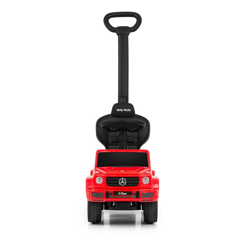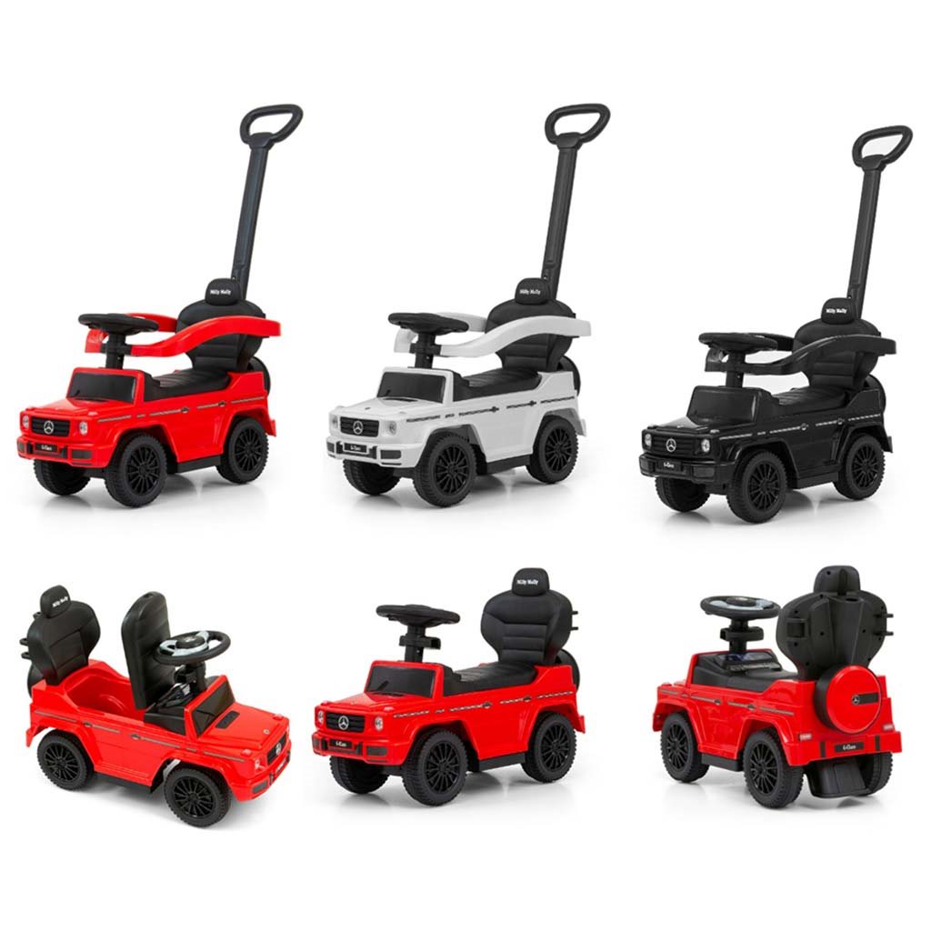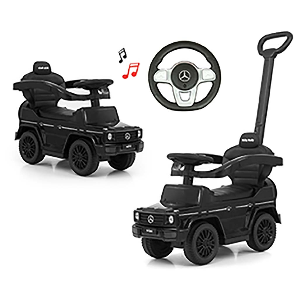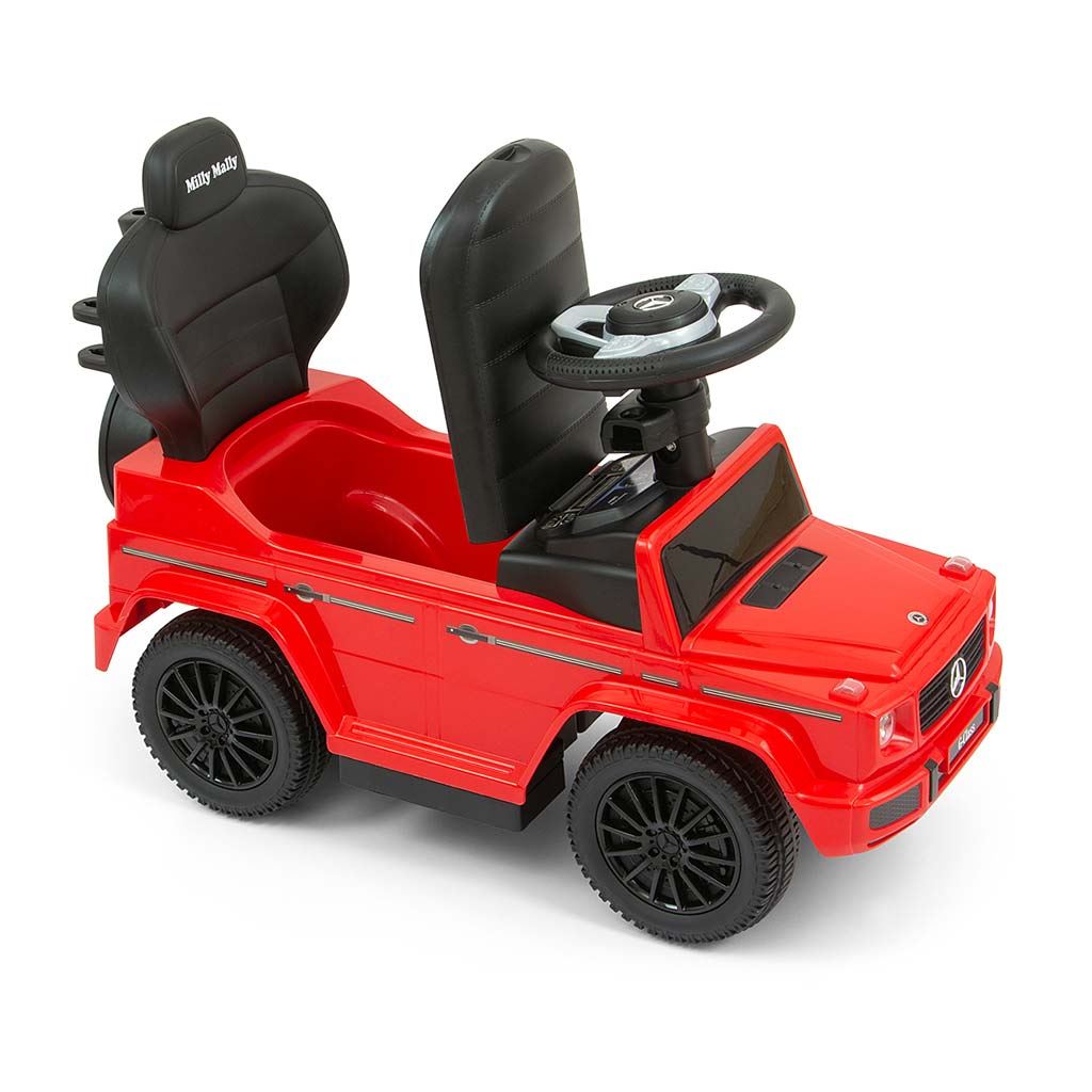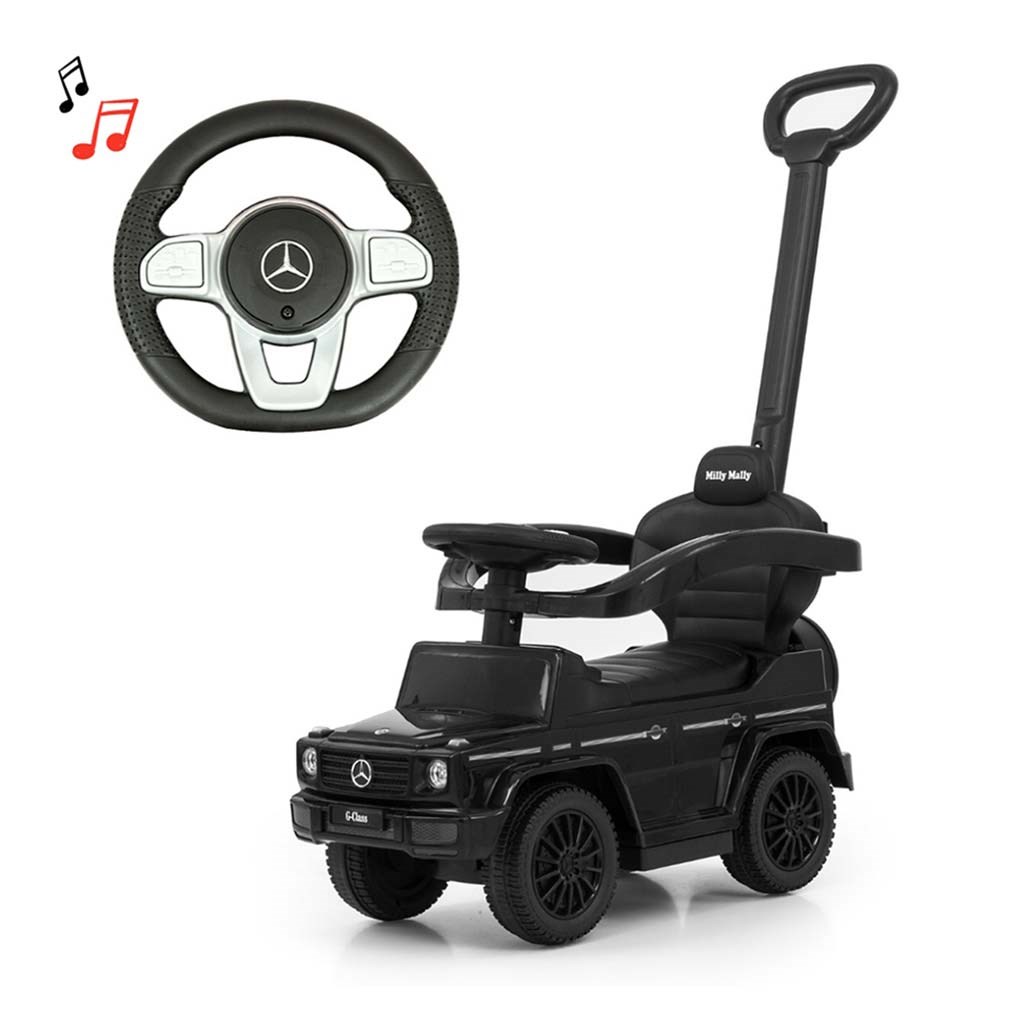 The MERCEDES G350d children's bicycle with guide bar is made under licence from the MERCEDES Group. Your little racer will feel like he or she is in a real jeep. The scooter is made with attention to every detail and the quality of the materials used. Its appearance will catch the attention of not only every child, but also parents. The scooter helps to develop the child's motor skills and your little racer or racer will have a lot of fun with it. The car has buttons on the three-arm steering wheel that emit different melodies, engine sound or horn. It is designed both for the smallest children who can already sit and for children who have already learned to walk. The scooter has swivel front wheels, a wide and comfortable seat with storage space and a comfortable yet sturdy guide bar that can be used to steer the scooter. The guide bar, armrests and footrests can be removed so that the child can use the car as a classic scooter. Batteries not included (2x AA 1.5V).