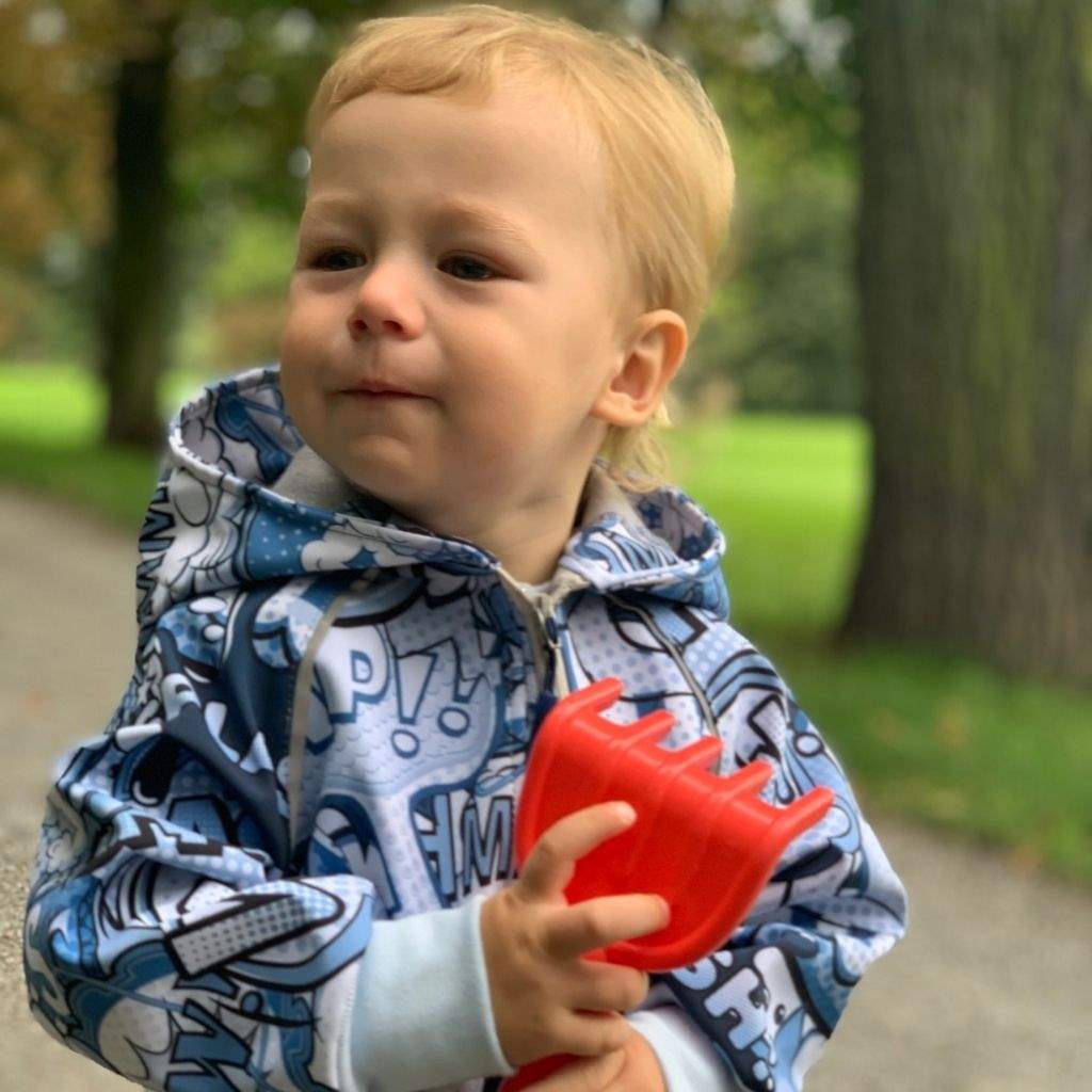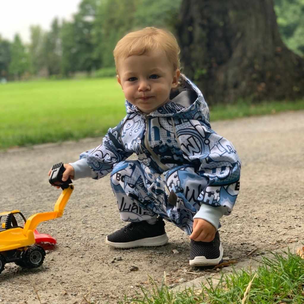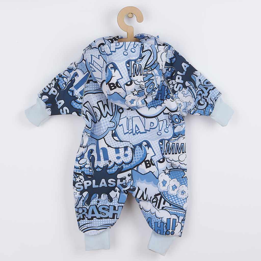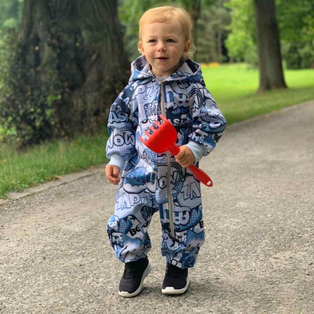 Imaginative softshell infant jumpsuit New Baby. The jumpsuit is fully printed with a baby pattern. Overalls are made in the Czech Republic from high quality softshell material. The material is smooth, elastic, soft and pleasant to the touch. It is also waterproof to a certain degree, does not soak up water and is resistant to pollution. The practical full-length zip fastening makes dressing and changing very easy. The full-length zip is lined with fabric, thus preventing wind from blowing onto the baby's skin. The jumpsuit has a practical hood, wider elasticated hems on the arms and legs and the entire inside is insulated with short cut fleece, which increases wearing comfort and provides warmth. The sleeves are sewn with reflective patches. The softshell jumpsuit is suitable as sportswear, it is both windproof and breathable. The baby will feel very comfortable and pleasant.