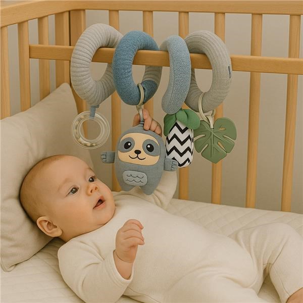 The toy features an incredibly creative and original sloth pattern that delights both children and adults. Equipped with various elements, including a squeaker, rattle, and teether, our spiral provides interactive and stimulating entertainment for your little explorer. Thanks to its flexible construction, you can easily attach it to a stroller or crib, ensuring fun both at home and during walks.