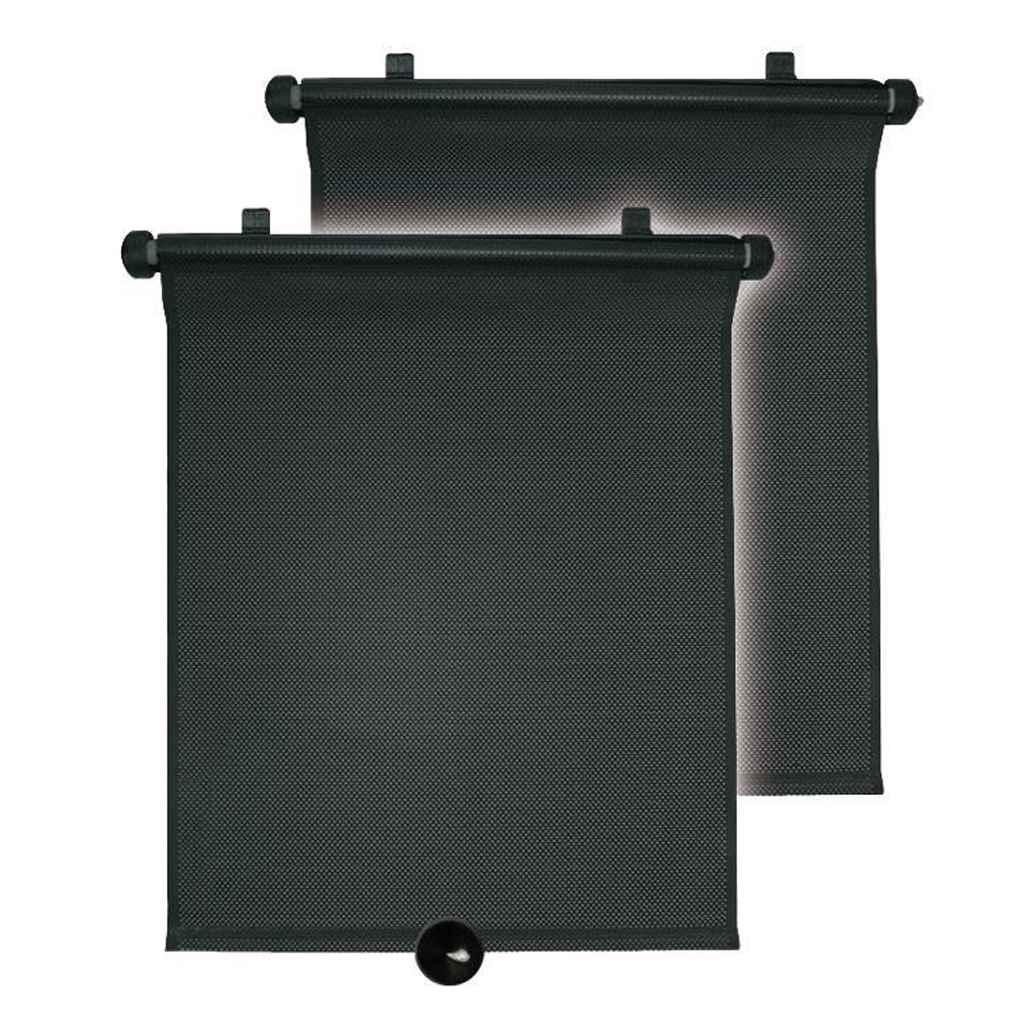 Shading roller blind for car window. The sun visor can be attached to the window with three suction cups or two adjustable hooks. The great advantage of the sunblind is that it can be locked in any position and at the push of a button the roller blind simply rolls up. The shades limit the penetration of the sun's rays, which prevents the temperature in the car from rising. Dimensions approx. 33x56 cm. 2 pieces per pack.