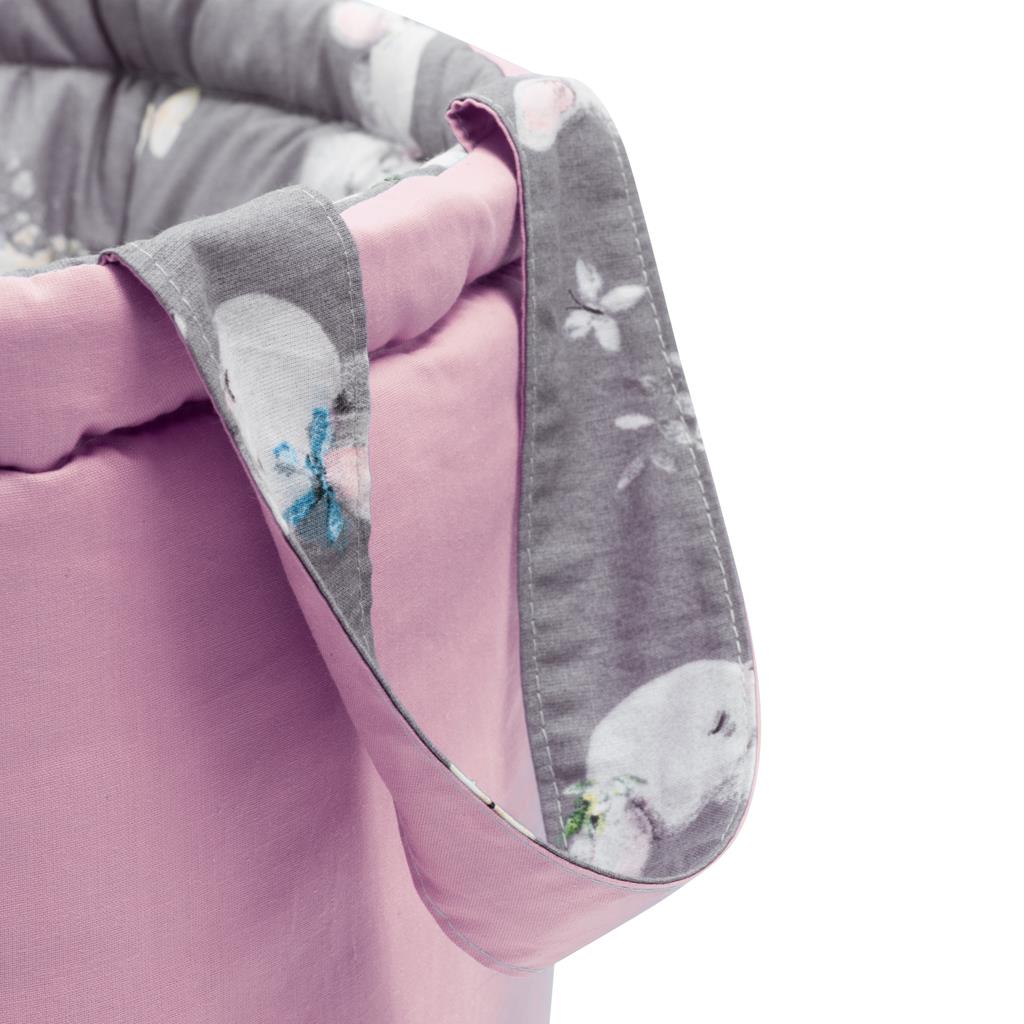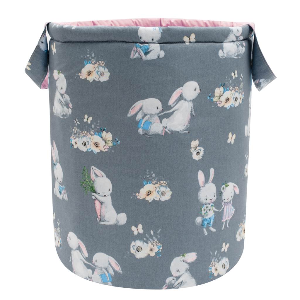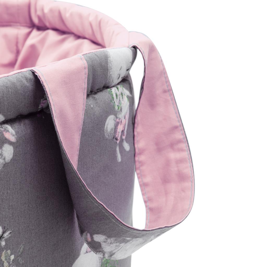 The New Baby bunny cotton basket is a practical accessory that you can use for quick cleaning of the room and as a transport space for toys. It can also be used as a basket for laundry or clothes. It is reversible and its cover is made of 100% cotton. It has been reinforced with a layer of polyester fibre which allows it to keep its shape, and it fits into a drawer when folded. It has handles for easy carrying.