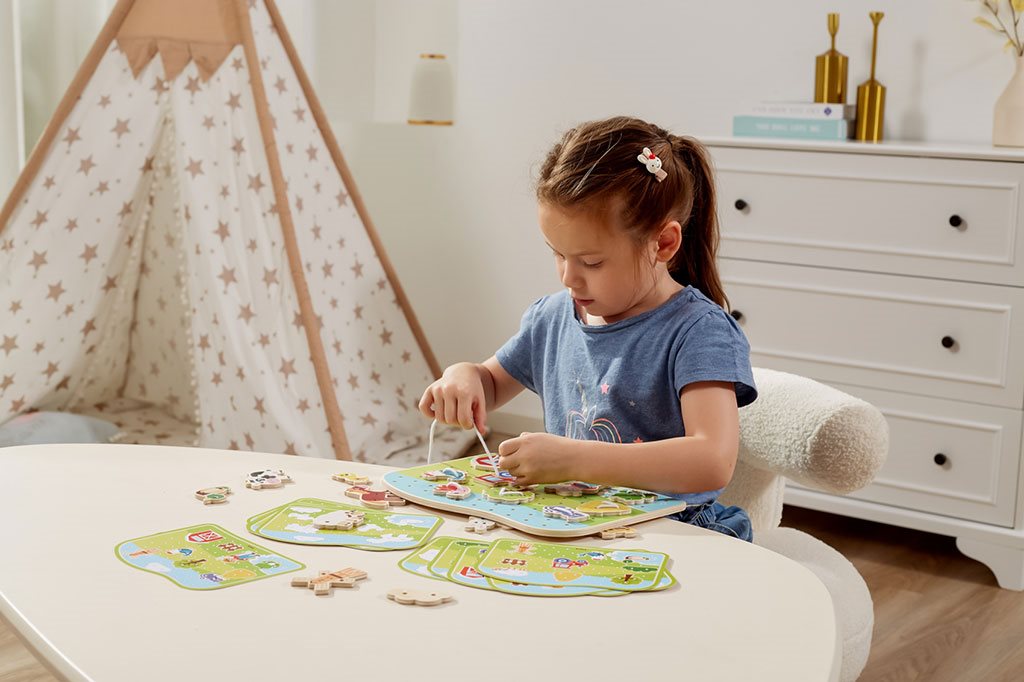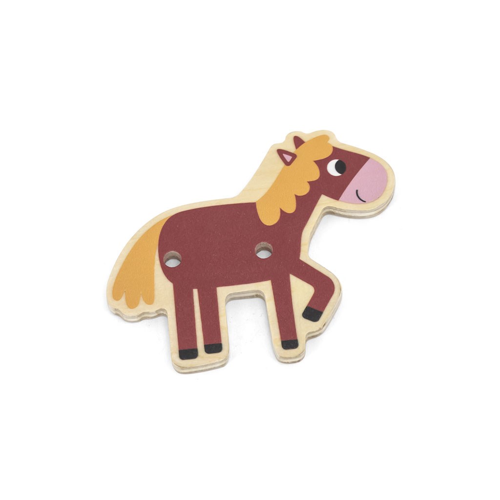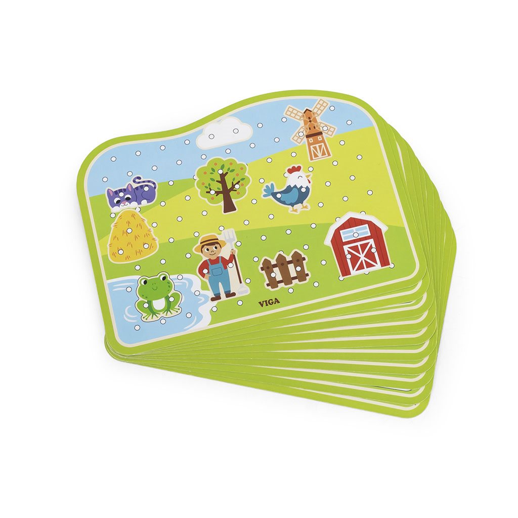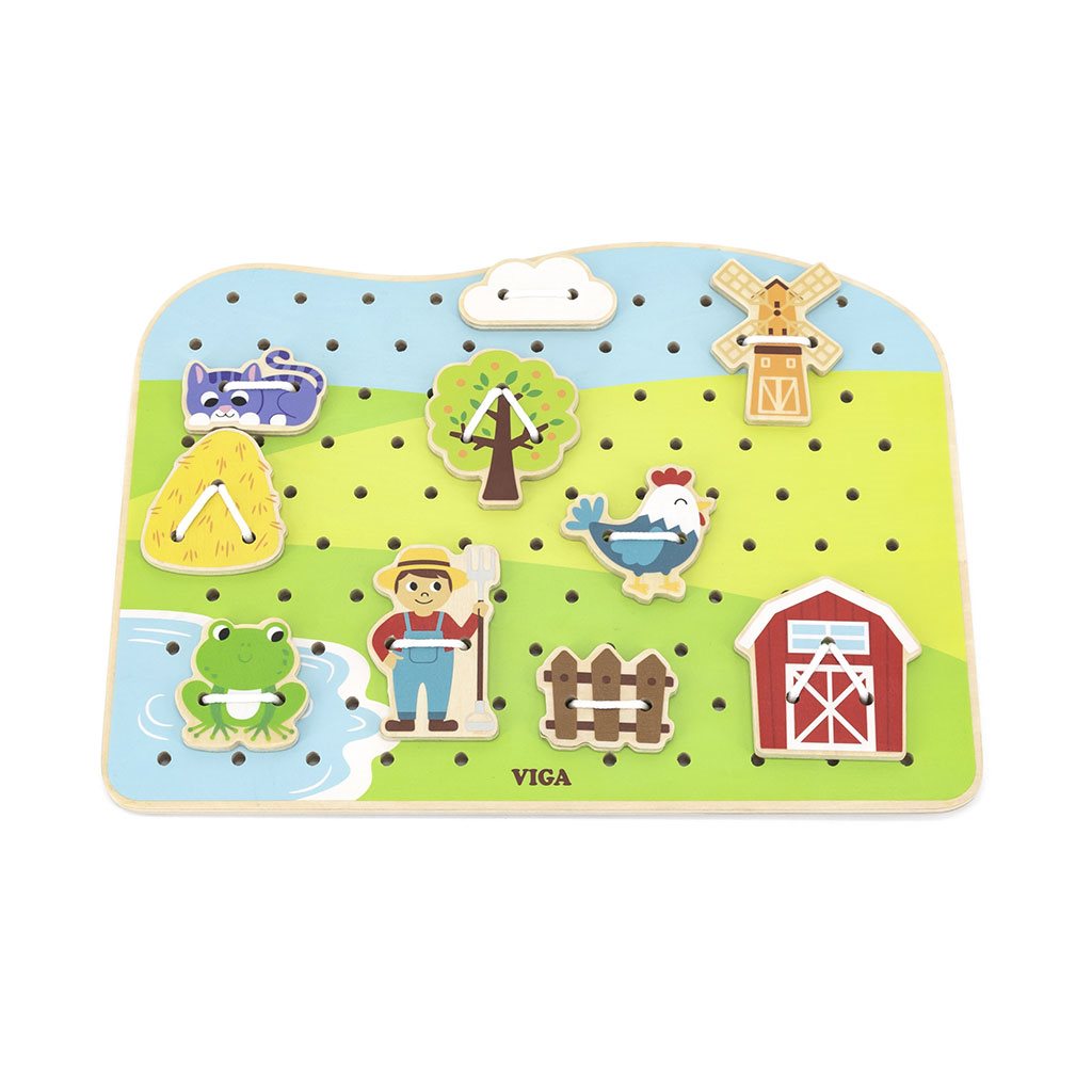The lacing game - farm from Viga is one of the most beautiful toys, this type of game improves eye and motor coordination or spatial orientation. The game includes a wooden base with holes and an illustration of a farm, 20 beautifully painted tiles depicting farm animals and the surrounding nature, and 10 cards showing different ways of stringing accessories on the board. The child matches and strings the plates to the patterns on the cards, which are alternately placed on the base. Toddlers thus have the opportunity to develop their imagination and can even build their own narrative from the available pieces.
