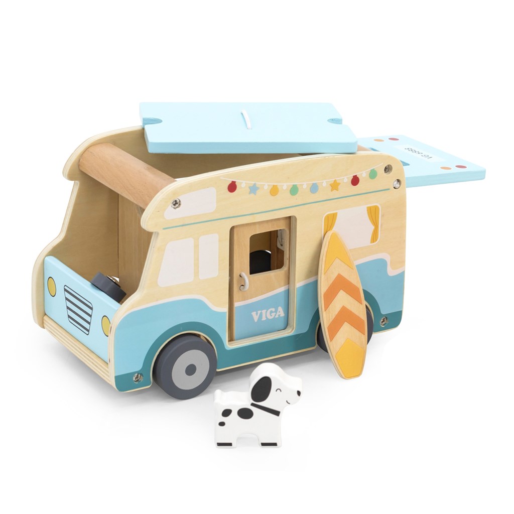 The wooden camper is an exceptional toy that transports children into a world of holiday adventures and summer trips! The set is inspired by carefree seaside getaways, and thanks to precise detailing and realistic features — such as sliding doors, a lift-up roof, and a roof rack for a surfboard — it offers hours of engaging and creative play. The camper comes with a rich set of accessories, including two dolls, a puppy, deck chairs with cushions, a beach umbrella, a grill, and even a surfboard, allowing children to enact various play scenarios. Kids can take on roles relating to traveling, relaxing on the beach, or organizing a picnic.