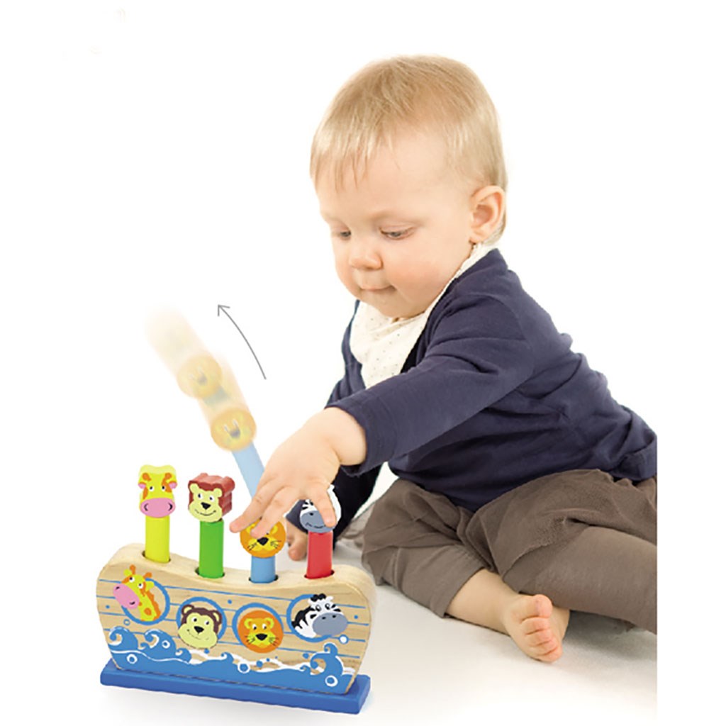 The wooden Noah's Ark game from Viga is a toy that every child will love. The child's task is to ""catapult"" the animals by pressing the animal heads, which are placed on a colourful wooden base. The giraffe, monkey, lion and zebra figures smile at the toddler while the child can learn to identify which animal has been placed on the wooden head.