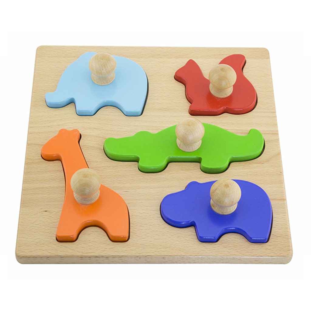 Colorful wooden puzzle stamps with handles. The stamps on a wooden base serve as a classic jigsaw puzzle, but also enrich the game with kinetic sand or plasticine, in which the child can imprint their shape. Thanks to the handles, the puzzles are easier for children to hold in their fingers and easier to insert into the designated places. It also helps improve manual dexterity and dexterity while teaching the child to recognise shapes and colours. It contributes to the development of motor skills, improves coordination and observation skills of the child. The pack contains 5 pieces. Designed for children from 12 months. The first puzzle for your little ones, it has very bold colours, simple design and large pieces. Our priority is the safety and quality of our products, so the colors used on the toys are non-toxic and meet safety standards (EN71 and ASTM). The toy is suitable as a beautiful gift for our little ones. Dimension approx:24x24x5cm