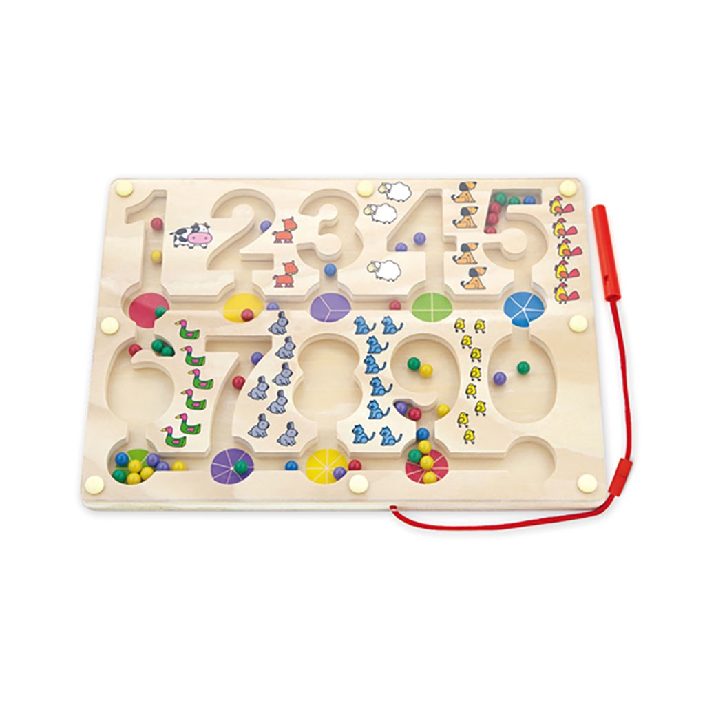 Learning numbers doesn't have to be boring! Magnetic maze is designed for children from 18 months. The toy has a maze with small coloured balls on its board, guide the balls to the corresponding numbers. From 1 through 2, 3, 4, 5, 6, 7, 8, 9 to 0. On one side of the board is a magnetic wand, which the toddler uses to drag the marbles to the correct places. To make it easier to match the number of marbles, there are animals and a wheel next to each box - with the gradation corresponding to the number. In addition, the characters of the featured animals encourage the child to play and explore the world around them.
