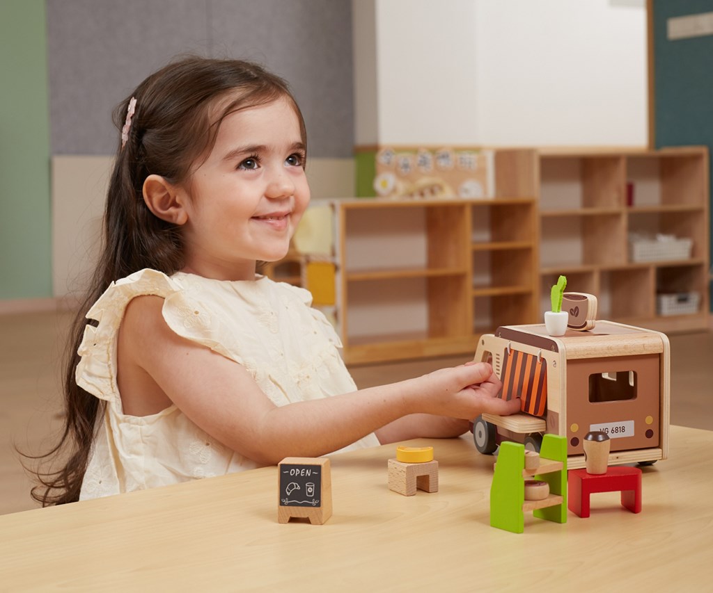 The wood-crafted café camper, painted in friendly colors, is ideal for developing imagination and social skills while providing a realistic role-play experience.