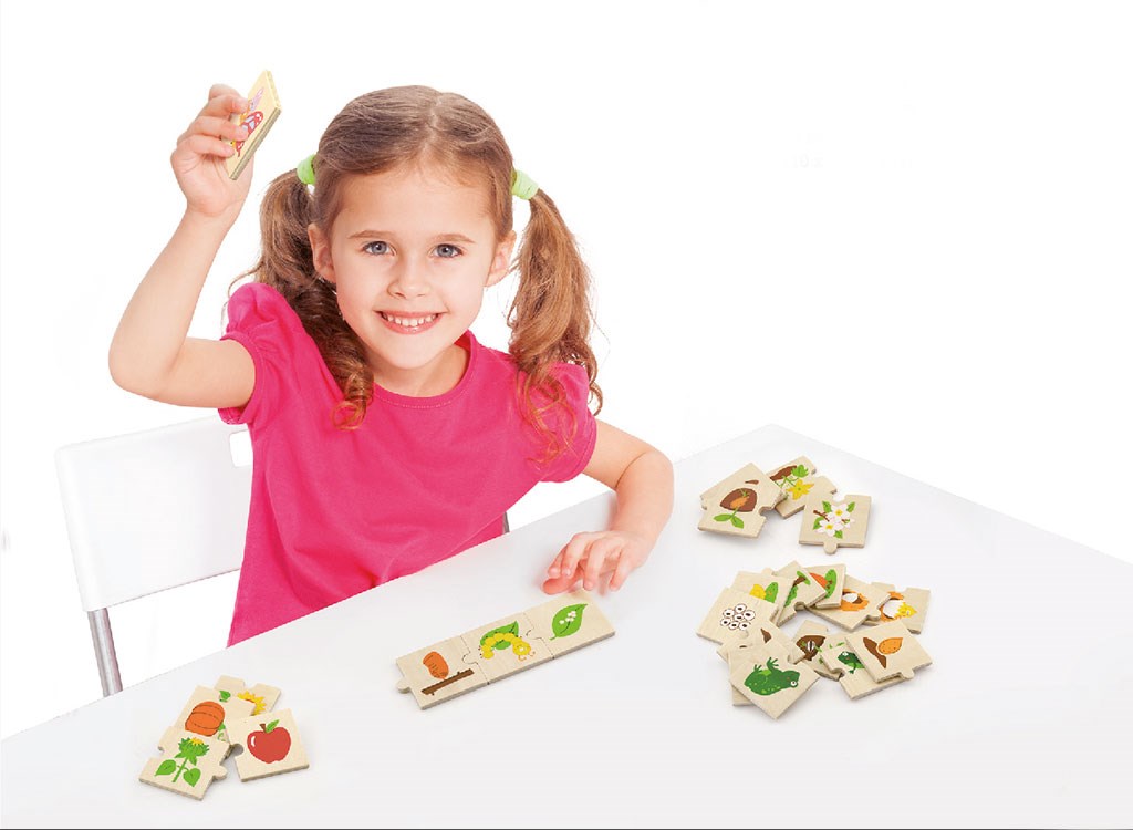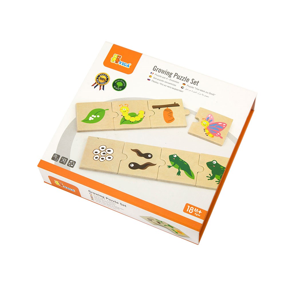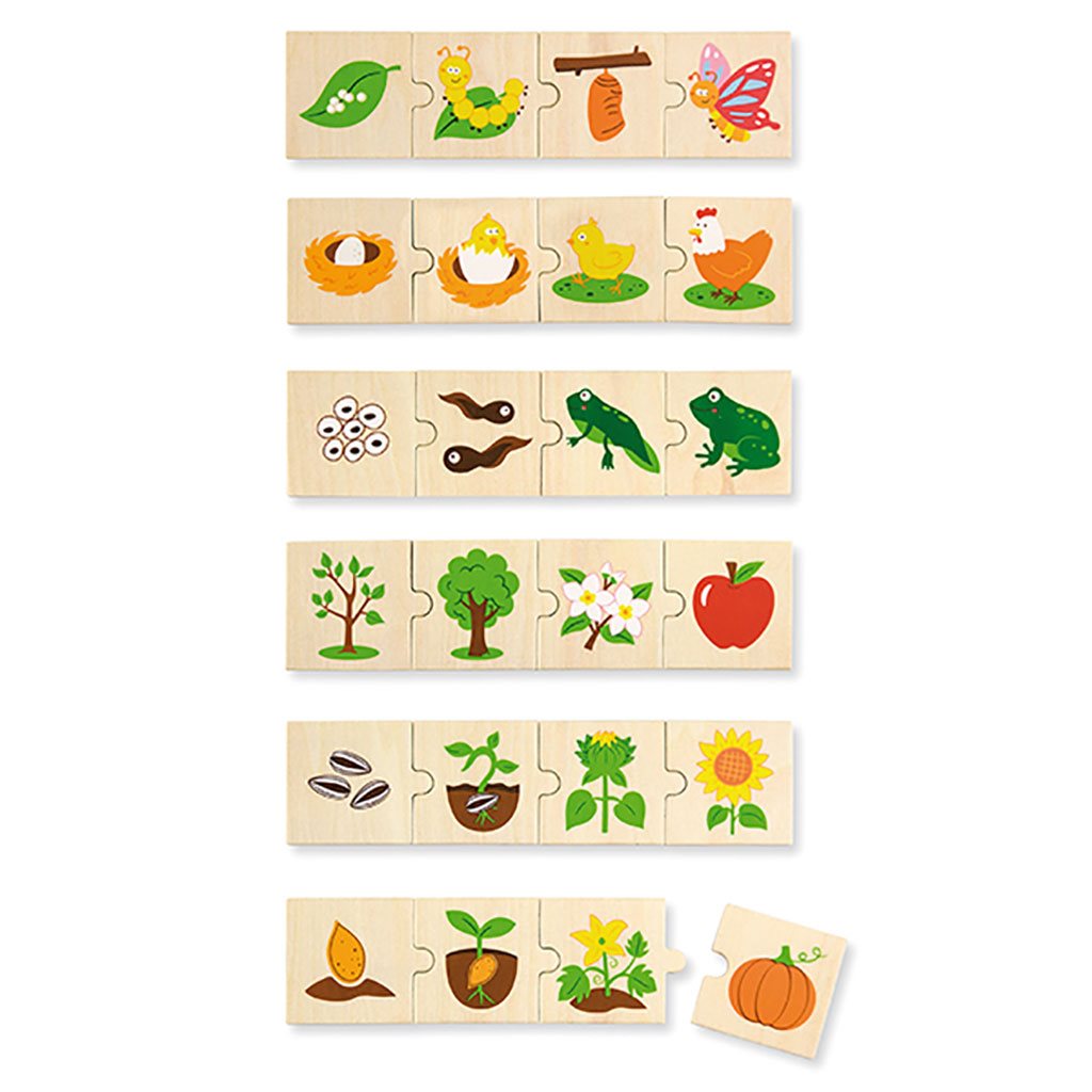 The set contains 24 wooden elements, on which there are colorful pictures showing the developmental stages of animals and plants. The puzzles are compatible - they can be combined freely.