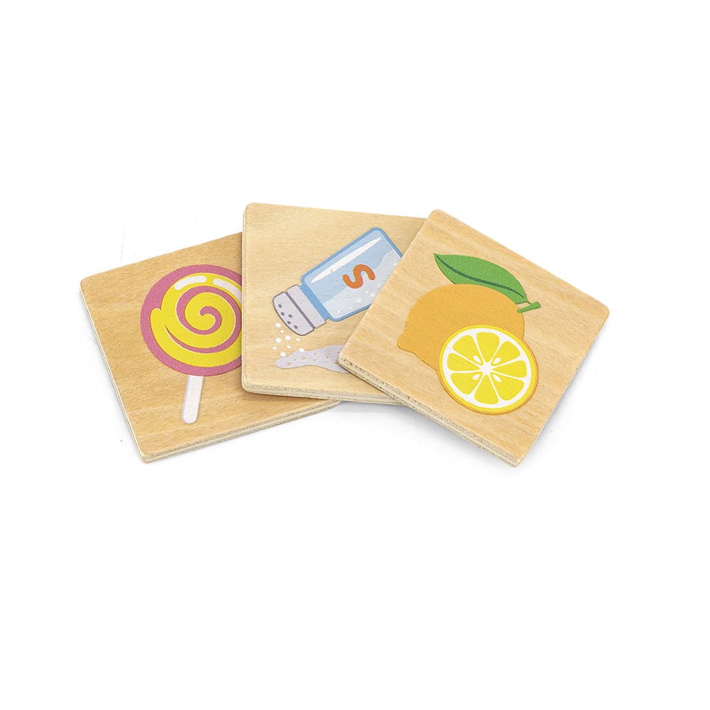 This wooden puzzle helps to explore and distinguish the senses. The puzzle can be assembled by matching the piece with the painted sense (taste, smell, touch, hearing and sight) to other pieces with the corresponding picture for that sense, or by rolling the die and selecting from all the pieces the element corresponding to the ""thrown"" sense. Another option is to select from all the puzzles all the pieces corresponding to, for example, the sense of taste.