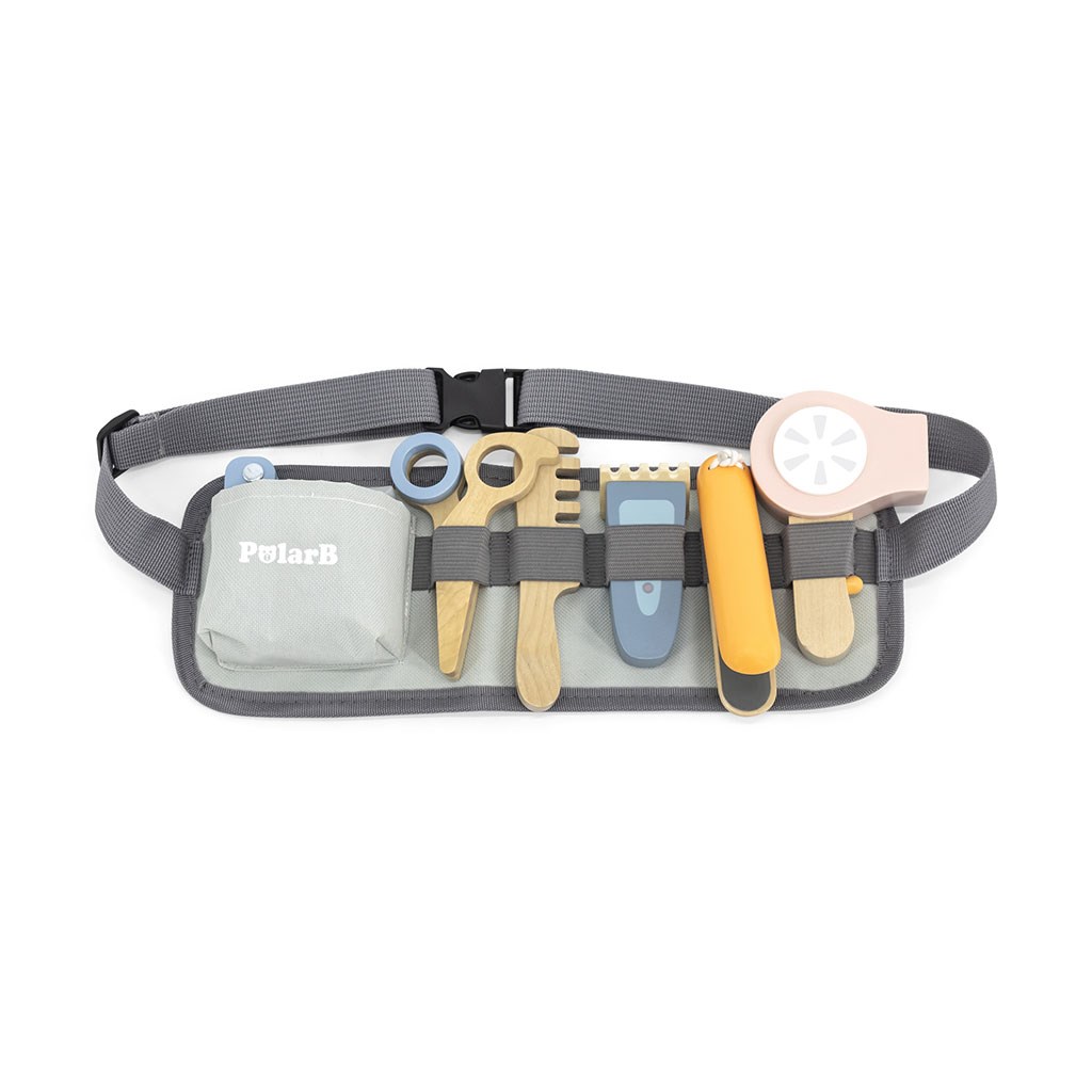 The set includes a hair dryer, comb, hair straightener, scissors, 2 cute elastics, beard shaver, razor and an adjustable belt with buckle.